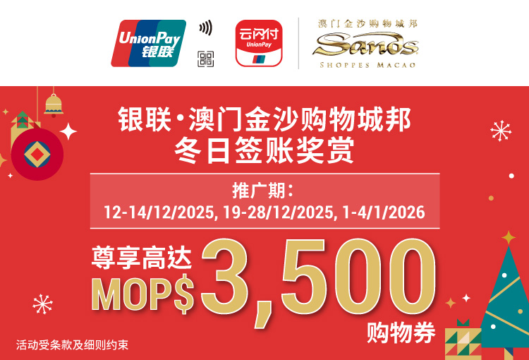 于威尼斯人购物中心、四季名店、巴黎人购物中心及伦敦人购物中心以银联卡消费签账满澳门币20,000元或以上,即可获赠价值高达澳门币3,500元之银联卡奖赏推广钱!