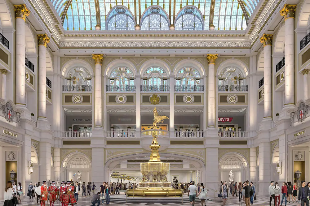 宾客经过参照旧维多利亚火车站设计的宏伟玻璃透光门廊,便即进入澳门伦敦人的核心地带水晶金殿。阳光满溢的中庭高33米(约10层楼高),主要使用玻璃和铁制建造,加入云石铺砌,打造错综复杂的天花,凸显维多利亚时期精湛的建筑风格。宾客还可于此欣赏到与实物同等大小的沙夫茨伯里纪念喷泉,顶端矗立着希腊无私的「相爱之神」安忒洛斯(Anteros)。